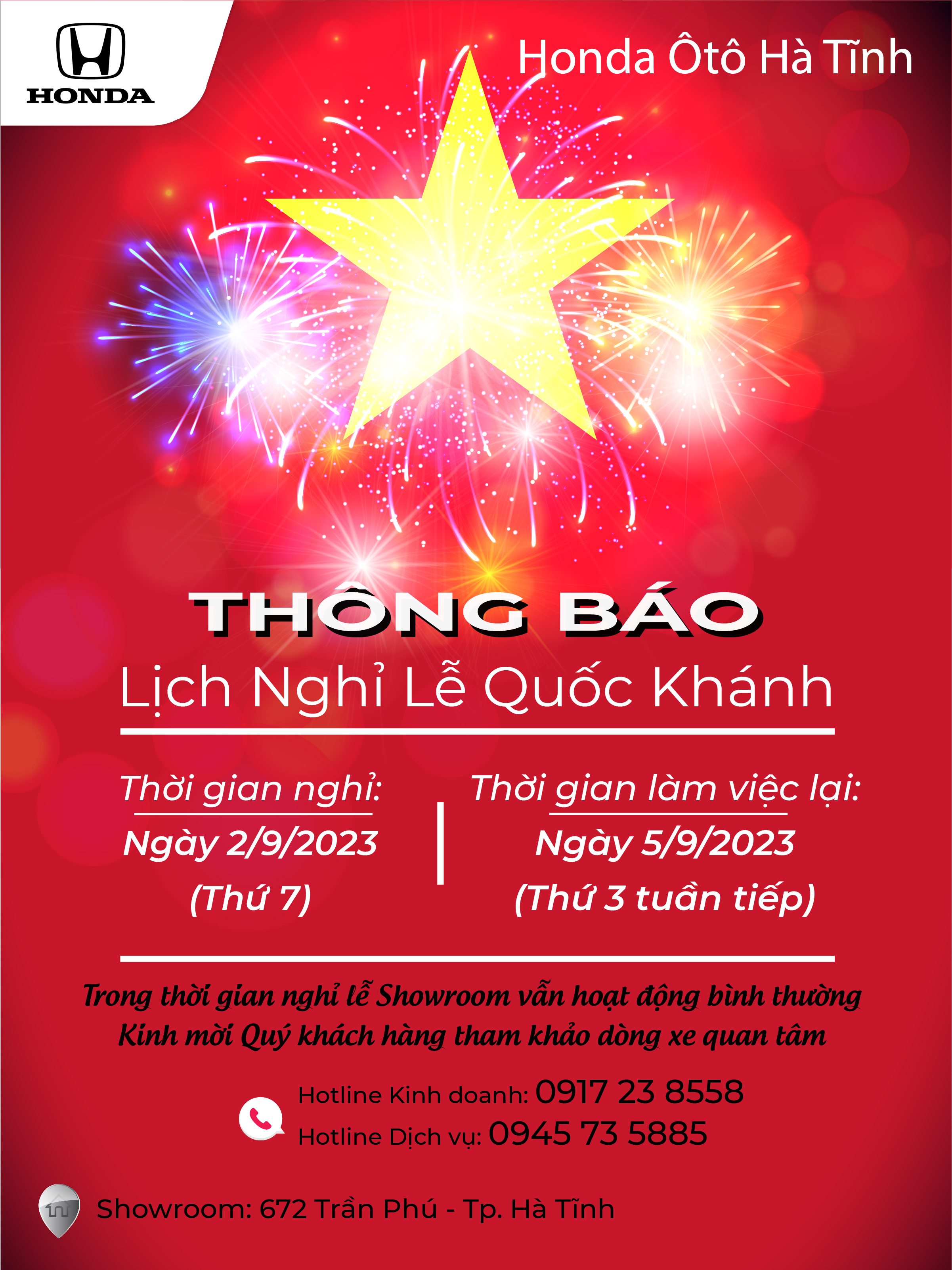 Tin tức & Sự kiện🎉THÔNG BÁO LỊCH NGHỈ LỄ QUỐC KHÁNH 02/09/2023Honda Ôtô Hà Tĩnh -Trần Phú xin trân trọng thông báo lịch nghỉ lễ Quốc Khánh 02/09/2023 đến Quý khách hàng như sau: Thời gian nghỉ lễ: Thứ 7 ( ngày 02/09/2023 ) đến Thứ 2 ( ngày 04/09/2023 ) Thời gian hoạt động trở lại: Honda Ôtô Hà Tĩnh -Trần Phú sẽ quay trở lại hoạt động bình thường từ Thứ 3 ( ngày 05/09/2023 ) Trong thời gian nghỉ lễ, Showroom vẫn hoạt động bình thường, Kính mời Quý Khách hàng tham khảo các dòng xe quan tâm.Chúc Quý Khách hàng và Quý đối tác có kỳ nghỉ lễ vui vẻ, hạnh phúc và an toàn bên gia đình. Link đặt hẹn trải nghiệm các dòng xe Honda Ôtô: https://bit.ly/thamdusukienLaithuMọi thắc mắc cần hỗ trợ, liên hệ ngay: Hotline Kinh doanh 24/7: 0917 23 8558 Hotline Dịch vụ 24/7: 0945 73 5885 – 02393.638.555Showroom: 672 Trần Phú – Tp. Hà Tĩnh